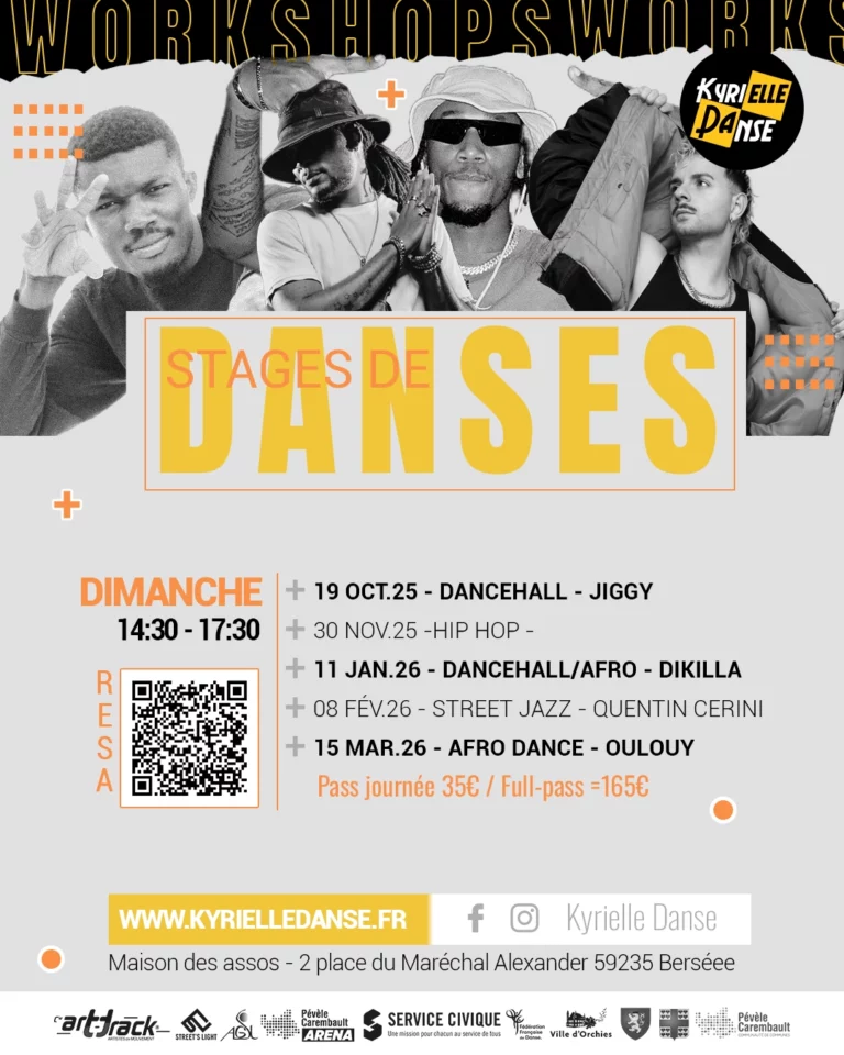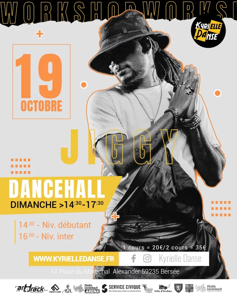 Kyrielle Danse vous invite à un événement exceptionnel le dimanche 19 octobre à la Maison des Associations de Bersée (17 Place du Maréchal Alexander, 59235 Bersée) : un atelier Dancehall animé par le talentueux danseur Jiggy !